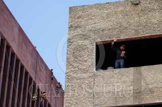 CIUDAD DE MÉXICO, 18JUNIO2024.- Un hombre trabaja en el marco de un ventanal, mientras que trabajadores de la construcción laboran colgados de arneses en la edificación de un inmueble en la esquina de avenida Juárez y Bucareli en la colonia Centro. FOTO: GALO CAÑAS/CUARTOSCURO.COM