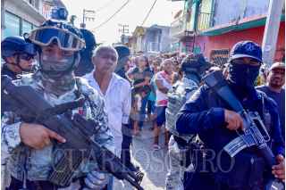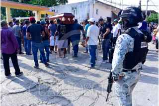 COPALA, GUERRERO, 18JUNIO2024.- Con un fuerte operativo de seguridad fue sepultado Salvador Villalba Flores, el alcalde electo del municipio de Copala, ubicado en la región de la Costa Chica de Guerrero, Villalba Flores resultó ganador en las pasadas elecciones del 2 de junio como candidato del partido México Avanza, y fue asesinado por un grupo de hombres armados que interceptaron el autobús en el que viajaba desde la Ciudad de México el lunes por la madrugada, durante el cortejo fúnebre hacia el panteón familiares, amigos y simpatizantes gritaron la consigna Justicia!! Justicia!! Varias veces. FOTO: CARLOS ALBERTO CARBAJAL/CUARTOSCURO.COM