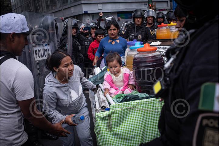 CIUDAD DE MÉXICO, 21JUNIO2024.- Elementos de la policía de la ciudad desalojaron a vendedores ambulantes de la Alameda Central que se encontraban protestando bloqueando la avenida Eje Central. FOTO: PEDRO ANZA /CUARTOSCURO.COM