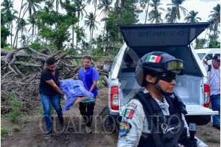 ACAPULCO, GUERRERO, 21JUNIO2024.- Integrantes del colectivo de búsqueda de personas desaparecidas "Fe y Esperanzas de Encontrarlos Guerrero" realizaron el hallazgo de un cuerpo dentro de una fosa clandestina en una huerta en la comunidad de El Cayaco en la zona rural de Acapulco. La identificación se realizó alrededor de las 10 de la mañana con el apoyo de la Unida Canina de la Fiscalía del Estado de Guerrero y de la Comisión Estatal de Búsqueda de Personas, después de las 2 de la tarde se hizo el levantamiento del cuerpo para ser trasladado a las instalaciones del Servicio Médico Forense. Hasta el momento no se ha podido precisar si se tratan de los restos de un hombre o de una mujer. FOTO: CARLOS CARBAJAL/CUARTOSCURO.COM
