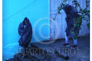 CUERNAVACA, MORELOS, 24JUNIO2024.- Una mujer que carga en sus brazos a su hijo y un hombre caminan bajo la lluvia cubiertos con una bolsa de basura acondicionada como impermeable. Durante toda la mañana ha llovido en la capital del estado y su área metropolitana, tomando por sorpresa a sus habitantes. Se pronostica que el clima seguirá igual lo que resta del día. FOTO: MARGARITO PÉREZ RETANA/CUARTOSCURO.COM