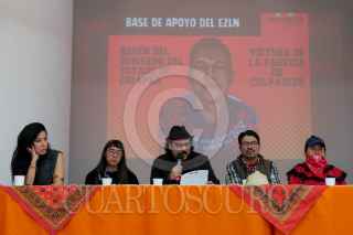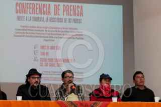 CIUDAD DE MÉXICO, 24JUNIO2024.- Pedro de Jesús Faro Navarro, Director del Frayba; un representante del Consejo Supremo Indígena de Michoacán; una representante de la Comunidad Otomí residente de la Casa de los Pueblos; y dos representantes de los pueblos Cholultecas y de los Volcanes, dieron una conferencia de prensa sobre el tema de la resistencia de los pueblos convocada por el Espacio de Coordinación Nacional Alto a la Guerra contra los Zapatistas, en el Centro de Derechos Humanos Miguel Agustín Pro. FOTO: ALICE MORITZ/CUARTOSCURO.COM