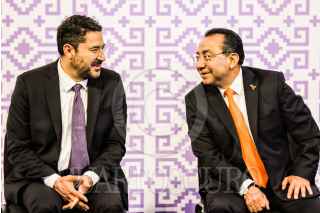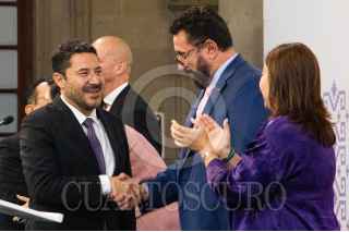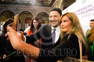 CIUDAD DE MÉXICO, 25JUNIO2024.- Martí Batres Guadarrama, Jefe de Gobierno, saluda a Ulises Lara, encargado de Despacho de la Fiscalía General de Justicia de la Ciudad de México, durante la presentación del informe mensual de la alerta por violencia de género, en el Antiguo Palacio del Ayuntamiento. FOTO: GOBIERNO DE LA CIUDAD/CUARTOSCURO.COM