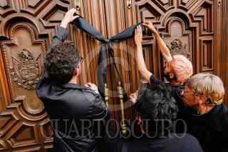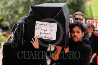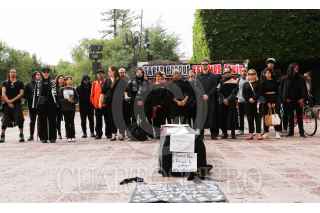 QUERETARO, QUERÉTARO. 26JUNIO2024.- En una manifestación pacífica realizada a las afueras de Palacio de Gobierno, integrantes de la comunidad artística cargaron un feretro simbólico para manifestarse en contra de la titular de la Secretaría de Cultura, Marcela Herbert Pesquera, a quien reiteraron pedir su renuncia o bien, que el gobierno de Mauricio Kuri González cese a la funcionaria estatal. FOTO: CÉSAR GÓMEZ/CUARTOSCURO.COM