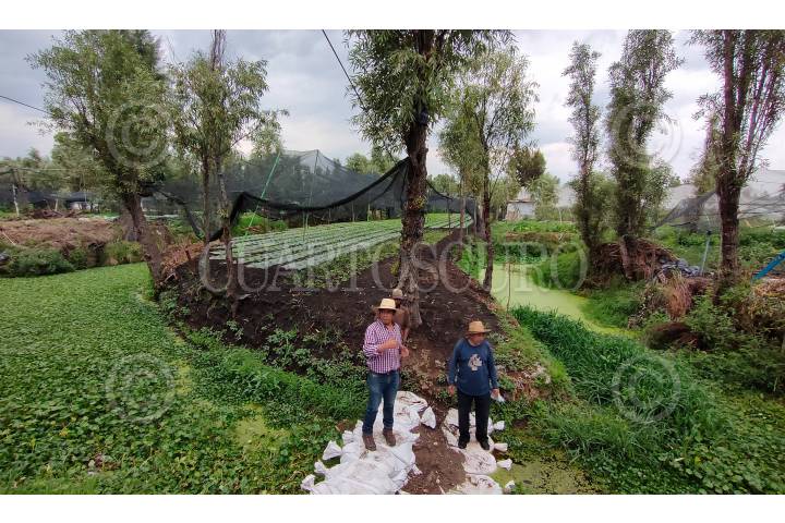 CIUDAD DE MÉXICO, 26JUNIO2024.- Los chinamperos de la zona emplearon decenas de costales de arena para poder conservar el agua que llega de Canal Nacional. FOTO: DANIEL AUGUSTO/ CUARTOSCURO.COM