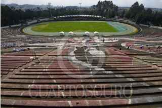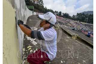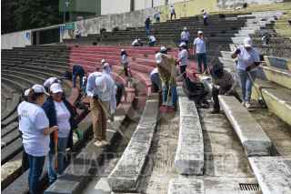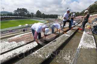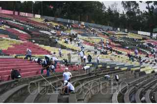 TOLUCA, ESTADO DE MÉXICO, 26JUNIO2024.- El mural Aratmósfera del maestro Leopoldo Flores que se encuentra en el estadio universitario Alberto “Chivo” Córdova será restaurado, este día alrededor de 350 voluntarios de facultades y diversos espacios universitarios participaron en la jornada de limpieza y preparación del lugar, que es la primera etapa de este proyecto de restauración, la siguiente etapa será la de pintura, a través de procesos tecnológicos se ha logrado recuperar trazos de esta obra que es un legado para los universitarios y mexiquenses, símbolo de la universidad, la ciudad y el estado. FOTO: CRISANTA ESPINOSA AGUILAR /CUARTOSCURO.COM
