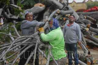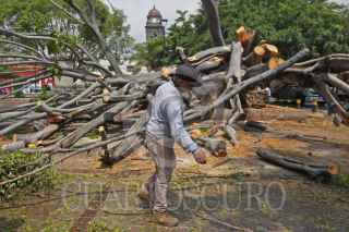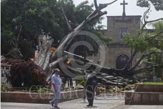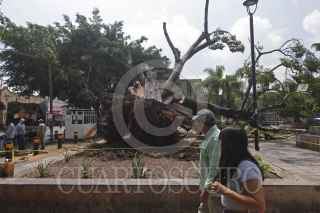 GUADALAJARA, JALISCO. 28JUNIO2024.- Un árbol de muchos años de antigüedad, cayó la noche de ayer en la Plaza principal de la colonia San Andrés, al oriente de Guadalajara, esto tras los fuertes vientos y la lluvia que afecto gran parte del Área Metropolitana de la ciudad, por suerte no se registraron personas heridas tras el hecho. FOTO: FERNANDO CARRANZA GARCIA / CUARTOSCURO.COM