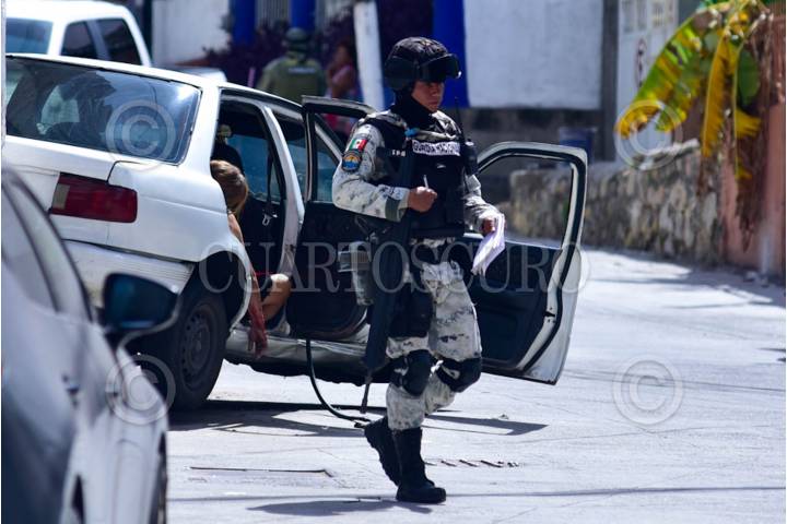 ACAPULCO, GUERRERO, 30JUNIO2024.- Esta tarde dos personas fueron asesinadas y una más resultó herida en un ataque armado a un taxi colectivo en el centro de Acapulco, el lugar fue resguardado por la Guardia Nacional, policías y soldados para que se realizará el peritaje. FOTO: CARLOS ALBERTO CARBAJAL/CUARTOSCURO.COM