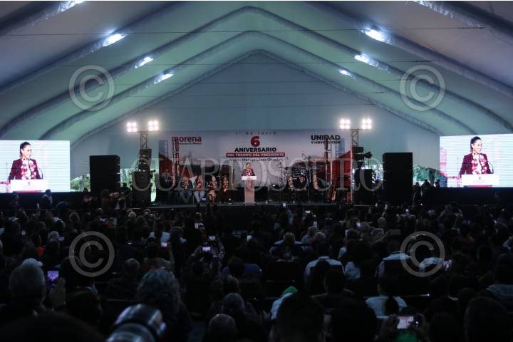 CIUDAD DE MÉXICO, 01JULIO2024.- Claudia Sheinbaum Pardo, virtual presidenta electa; Clara Brugada, jefa de Gobierno electa y Mario Delgado encabezaron el evento por el 6to aniversario del triunfo del presidente Andrés Manuel López Obrador que se llevó a cabo en el completo de los pinos. FOTO: ANDREA MURCIA /CUARTOSCURO.COM