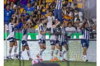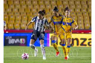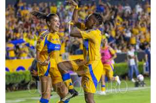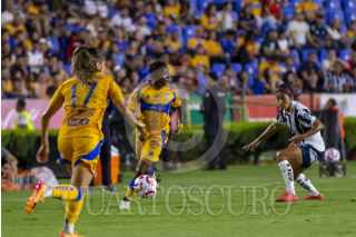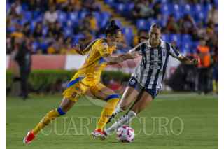 SAN NICOLÁS DE LOS GARZA, NUEVO LEÓN, 01JULIO2024.- Natalia Villarreal de Tigres Femenil, se disputa el balón con Ana Martínez de las Rayadas del Monterrey, en el estadio Universitario, partido correspondiente al a vuelta de Campeón de Campeonas 2024. Marcador al medio Tiempo: Tigres Femenil: 0 - Rayadas: 1. FOTO: GABRIELA PÉREZ MONTIEL / CUARTOSCURO.COM