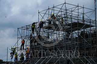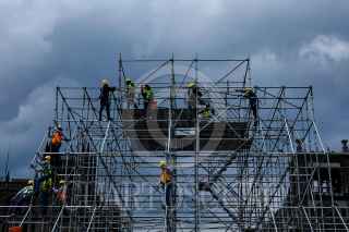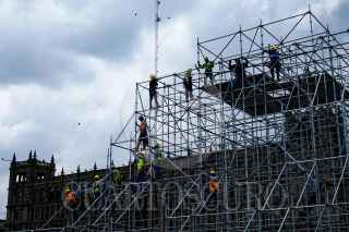 CIUDAD DE MÉXICO, 02JULIO2024.- Trabajadores arman la estructura en que se montará una réplica de 15 metros de la pirámide de Kukulcán en la plancha del Zócalo. Lo anterior, con motivo del centenario luctuoso de Flipe Carrillo Puerto. El espectáculo será una proyección 2D y 3D de 360º grados. FOTO: GALO CAÑAS/CUARTOSCURO.COM