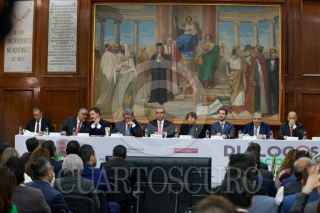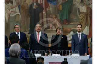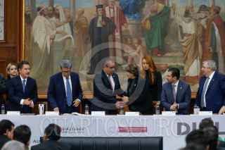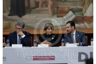 TOLUCA, ESTADO DE MÉXICO, 02JUNIO2023.- Delfina Gómez Álvarez, Gobernadora del Estado de México, el diputado local Elias Rescala presidente de la JUCOPO, el Senador Ricardo Monreal, Diputado Federal Ignacio Mier durante los Diálogos Nacionales Reformas Constitucionales al Poder Judicial “Austeridad, Fideicomisos y Derecho Laboral de los Trabajadores del Poder Judicial” que se llevaron a cabo en la Cámara de Diputados del Estado de México. FOTO: CRISANTA ESPINOSA AGUILAR /CUARTOSCURO.COM