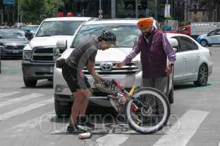 CIUDAD DE MÉXICO, 03JULIO2024.- Un joven ciclista fue atropellado por un conductor en el cruce de avenida Reforma y Juárez. Ambas partes se culparon del percance. El joven se levanto por su cuenta pero pidió al responsable que le llamara a su seguro para deslindar responsabilidad. FOTO: MOISÉS PABLO/CUARTOSCURO.COM