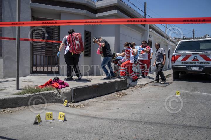 TIJUANA BAJA CALIFORNIA, 03JULIO2024.- Durante esta tarde en la colonia Guadalupe Victoria, sobre la calle Álvaro Obregón y la Vía Rápida con dirección a Zona Río, se registró un ataque armado en contra de una familia que iba a bordo de un vehículo. Autoridades policíacas arribaron al lugar y encontraron al interior de un taller municipal ubicado sobre la calle Álvaro Obregón una camioneta Suburban de color blanco con impactos de arma de fuego y a 2 hombres y 1 una mujer lesionados por disparos de arma de fuego. Paramédicos de la cruz roja arribaron para brindar los primeros auxilios a los lesionados y trasladarlos hacia un hospital en estado grave para continuar con su atención médica en compañía de una menor quien también viajaba en la camioneta y resultó ilesa. Según información extraoficial los responsables huyeron por la vía rápida Oriente a bordo de un vehículo Jeep Cherokee de color gris. El ataque armado fue contrarrestado por los escoltas de la familia, quienes se enfrentaron a los agresores, sobre la calle quedaron varios indicios balísticos. Elementos de diferentes corporaciones policíacas desplegaron un fuerte operativo en las zonas aledañas al ataque para buscar a los responsables. La zona quedó resguardada por elementos de la policía municipal, mientras que agentes de la fiscalía y servicios periciales realizaban las investigaciones correspondientes. FOTO: OMAR MARTÍNEZ/CUARTOSCURO.COM