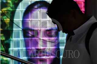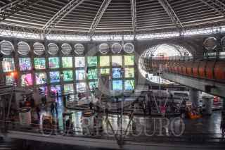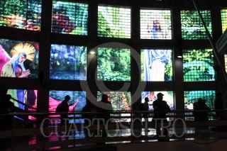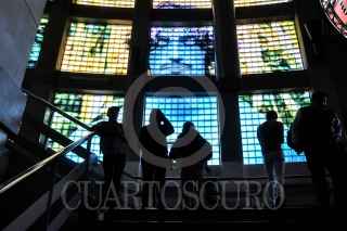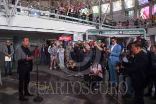 CIUDAD DE MÉXICO, 04JULIO2024.- Usuarios del Sistema de Transporte Colectivo (STC) Metro, durante la inauguración de “San Lázaro Iluminado” intervención artística de 26 obras en ventanales de gran formato del fotógrafo estadounidense David LaChapelle en la estación de metro San Lázaro de la línea B. FOTO: MARIO JASSO/CUARTOSCURO.COM