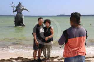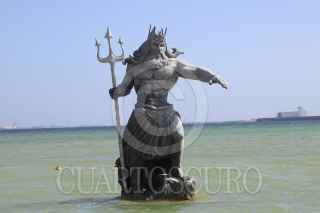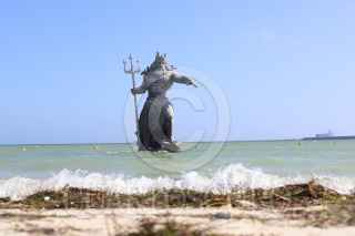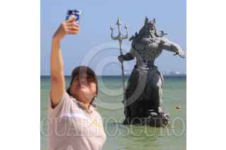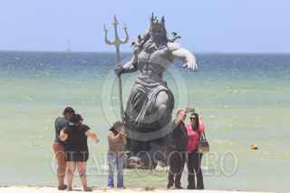 PROGRESO, YUCATÁN, 04JULIO2024.- Turistas locales e internacionales visitaron la estatua de Poseidón que se encuentra instalada en la Playa de Puerto Progreso. Esta pieza fue instalada por el ayuntamiento con el objetivo de convertirse en un atractivo turístico. En los últimos días se ha hecho viral, a través de las redes sociales, una convocatoria para retirarla ya que las personas consideran que su presencia ha desatado la ira del dios maya Chaac por estar admirando a dioses extranjeros y en castigo a mandado varias tormentas, como el huracán Beryl que está próximo a tocar el sureste mexicano. FOTOS MARTÍN ZETINA/CUARTOSCURO.COM
