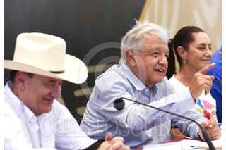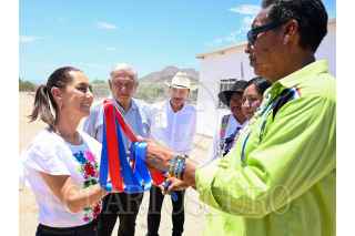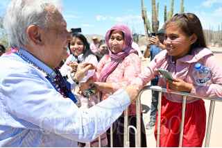 PITIQUITO, SONORA, 06JULIO2024.- Andrés Manuel López Obrador, presidente de México, durante la presentación del Plan de Justicia para el Pueblo Seri - Comca’ac en el pozo Santa Rosa. Estuvieron acompañados por: Janeth Mazón García, presidenta municipal de Pitiquito, Sonora; Enrique Robles Barnett, presidente del Consejo de Ancianos de la Nación Comca'ac; Germán Arturo Martínez Santoyo, director general de la Comisión Nacional del Agua (Conagua); Edna Elena Vega Rangel, subsecretaria de Ordenamiento Territorial y Agrario de la Secretaria de Desarrollo Agrario, Territorial y Urbano y responsable del “Programa de Vivienda”; Adelfo Regino Montes, director general del Instituto Nacional de los Pueblos Indígenas; José Rafael Ojeda, secretario de Marina; Alfonso Durazo, gobernador de Sonora; Rey Aldino Morales Romero, delegado municipal de Punta Chueca del municipio de Hermosillo, Sonora; Gabriela Molina Moreno, regidora Étnica de El Desemboque; Juan Pablo de Botton Falcón, subsecretario de Egresos de la Secretaría de Hacienda y Crédito Público; Octavio Alberto Almada Palafox es el titular de la Comisión Nacional de Acuacultura y Pesca; María Luisa Astorga Flores, consejo de Ancianos Comca’ac y Alberto Mellado Moreno, regidor étnico de Punta Chueca. FOTO: PRESIDENCIA/CUARTOSCURO.COM