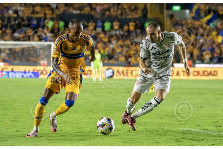 SAN NICOLÁS DE LOS GARZA, NUEVO LEÓN, 06JULIO2024.- Luis Quiñones de Tigres, se disputa el balón con Manuel Mayorga de Necaxa, en el estadio Universitario, partido correspondiente a la jornada 1 de la Apertura 2024 de la Liga MX. Marcador Final: Tigres: 1 - Necaxa: 0. FOTO: CUARTOSCURO.COM