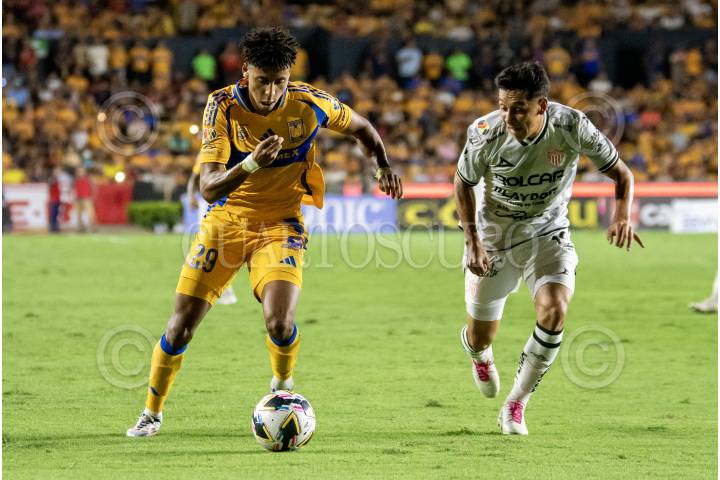 SAN NICOLÁS DE LOS GARZA, NUEVO LEÓN, 06JULIO2024.- Jonathan Herrera de Tigres, se disputa el balón con Raúl Sandoval de Necaxa, en el estadio Universitario, partido correspondiente a la jornada 1 de la Apertura 2024 de la Liga MX. Marcador Final: Tigres: 1 - Necaxa: 0. FOTO: CUARTOSCURO.COM