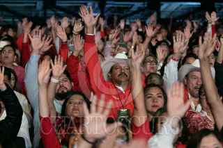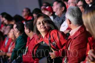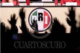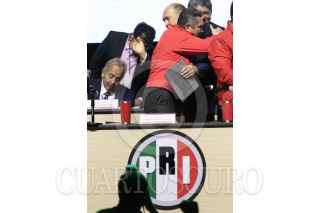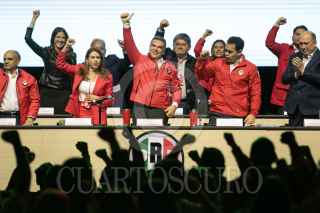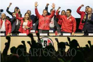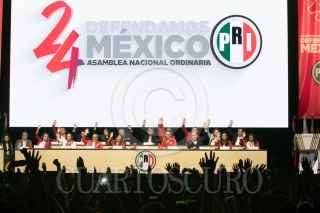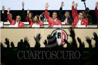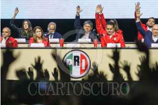CIUDAD DE MÉXICO, 07JULIO2024.- Alejandro Moreno Cárdenas, dirigente nacional del PRI, celebra junto con Manuel Añorve, Carolina Viggiano Austria, Pablo Guillermo Angulo Briceño, y Rubén Moreira, tras las modificaciones a los estatutos del PRI, esto durante la 24 Asamblea Nacional Ordinaria del tricolor, que se realizó a puerta cerrada en el Pepsi Center. Con este cambio de reglas se abre la posibilidad de que la dirigencia se pueda reelegir de aquí hasta el 2032. FOTO: MOISÉS PABLO/CUARTOSCURO.COM