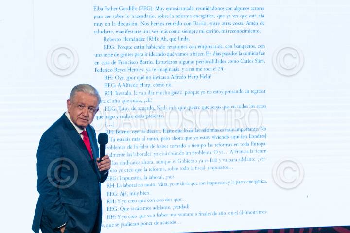 CIUDAD DE MÉXICO, 08JULUO2024.- Andrés Manuel López Obrador, Presidente de México, muestra la transcripción de una llamada entre Roberto Hernández y la maestra Elba Esther Gordillo, en la cual afirma que el empresario influía en las reformas que se impulsaba en el gobierno, esto durante la mañanera. FOTO: MOISÉS PABLO/CUARTOSCURO.COM