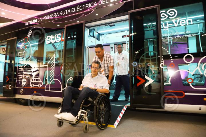 MÉRIDA, YUCATÁN, 09JULIO2024.- En el marco de la quinta edición del Smart City Expo LATAM Congress 2024 se presentó una unidad de transporte público del sistema Va y Ven que dará servicio en Mérida, el cual se caracteriza por ser de fácil accesibilidad para personas con discapacidades físicas. Luis Quintana, originario de Cuernavaca, accedió a hacer una demostración para que confirmar que las unidades son amigables para las personas que se movilizan en silla de ruedas, ahí confirmó que este transporte, que también es totalmente eléctrico, cuenta con rampas y cinturones de seguridad para que los traslados sean seguros. FOTO: MARTIN ZETINA/CUARTOSCURO.COM
