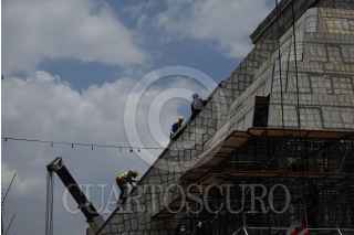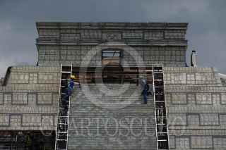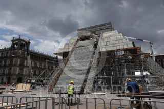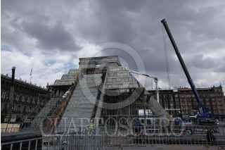 CIUDAD DE MÉXICO, 09JULIO2024.- Continúa el armado e instalación de la replica de la pirámide de Kukulcán en el Zócalo capitalino. La estructura formará parte de la proyección 2D y 3D propuesta por la Secretaria de Cultura capitalina para el espectáculo “El Pueblo Maya y Felipe Carrillo Puerto”. FOTO: GALO CAÑAS/CUARTOSCURO.COM