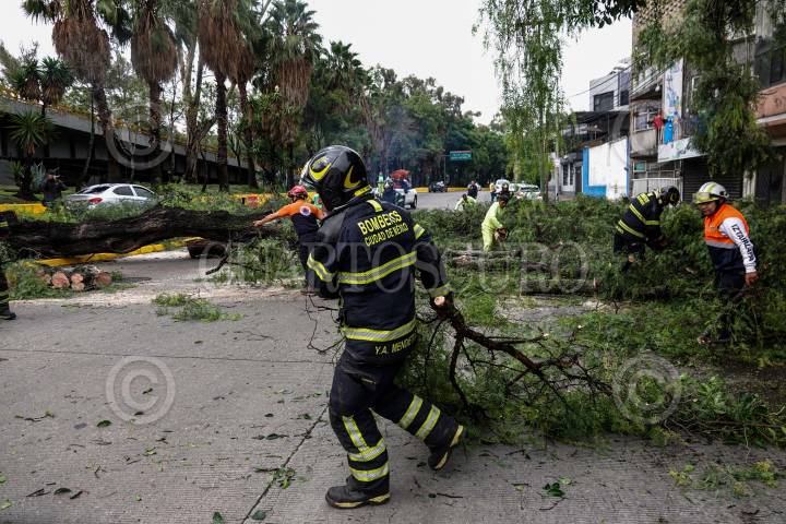 CIUDAD DE MÉXICO, 11JULIO2024.- Personal de protección civil y de bomberos de la Ciudad de México trabajaron para retirar un árbol que cayó durante la mañana en la lateral de Circuito Interior Río Churubusco, en la alcaldía Iztapalapa. La circulación se vio afectada al menos por una hora en lo que se realizaron las labores, cabe mencionar que la noche de ayer una fuerte lluvia azotó el sur de la ciudad lo que pudo provocar el reblandecimiento del suelo. FOTO: GALO CAÑAS/CUARTOSCURO.COM