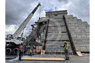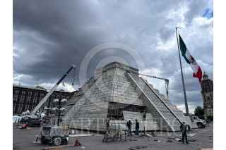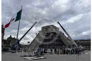 CIUDAD DE MÉXICO, 11JULIO2024.- Casi terminada a un día de que se inaugure la réplica de la pirámide de Kukulkán que está siendo construida en la explanada del Zócalo capitalino, para el mapping “El Pueblo Maya y Felipe Carrillo Puerto, Memoria Luminosa II”, que se realizará del 12 al 21 de julio. FOTO: ANDREA MURCIA /CUARTOSCURO.COM