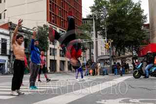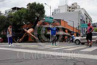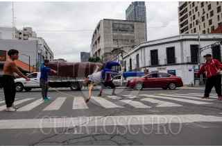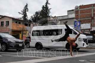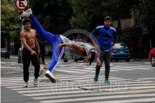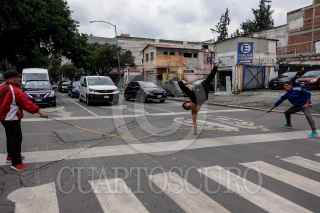 CIUDAD DE MÉXICO, 11JUNIO2024.- Entre break dance, freestyle y acrobacias, seis jóvenes que responden a los nombres de Aroll AMZ, Gohan (Venezuela), Mike, Mero y Erik se reúnen al cruce de Bucareli y Avenida Morelos para poner a prueba sus habilidades y obtener alguna remuneración económica por parte de los automovilistas que esperan a cruzar. Es al ritmo de la música disco y con una cuerda forrada de amarillo que el grupo aprovecha los segundos para mostrar su espectáculo callejero, expresan que son los días jueves, viernes y sábado que se reúnen desde las 13:00hrs y hasta “que salga” el día. FOTO: GALO CAÑAS/CUARTOSCURO.COM