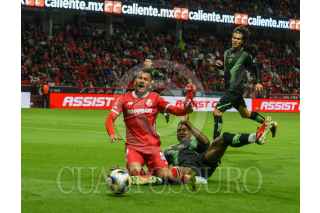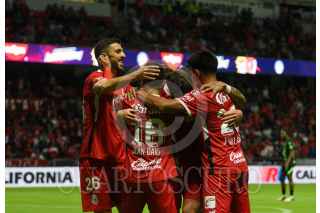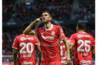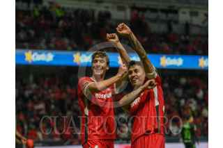 TOLUCA, ESTADO DE MÉXICO, 13JULIO2024.- Marcel Ruíz medio y Claudio Baeza medio de los Diablos de Toluca festejan la segunda anotación ante Bravos de Juárez, en el partido correspondiente la jornada 2 del Torneo Apertura 2024 de la Liga MX, el marcador final quedó 3-2 a favor de la escuadra escarlata. FOTO: CRISANTA ESPINOSA AGUILAR /CUARTOSCURO.COM