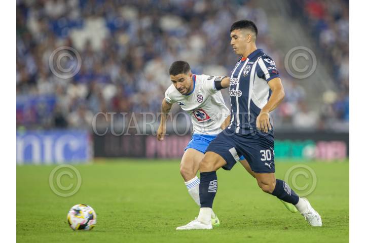 GUADALUPE, NUEVO LEÓN, 13JULIO2024.- Jorge Rodríguez de los Rayados del Monterrey, se disputa el balón con José Rivero del Cruz Azul, en el estadio BBVA, partido correspondiente a la jornada 2 de la Apertura 2024 de la Liga Mx. Marcador Final: Monterrey: 0 - Cruz Azul: 4. FOTO: GABRIELA PÉREZ MONTIEL / CUARTOSCURO.COM