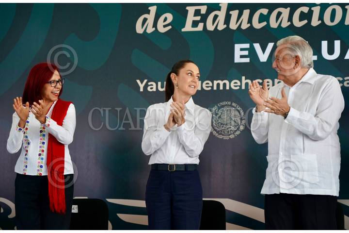 YAUHQUEMEHCAN, TLAXCALA, 14JULIO2024.- Leticia Ramírez, secretaria de Educación Pública (SEP); Andrés Manuel López Obrador, Presidente de México, y Claudia Sheinbaum, Presidenta Electa de México, encabezaron el evento: Evaluación de programas y proyectos de educación y deporte. FOTO: PRESIDENCIA/CUARTOSCURO.COM