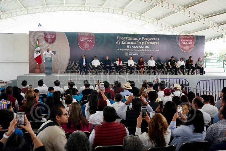 YAUHQUEMEHCAN, TLAXCALA, 14JULIO2024.- Andrés Manuel López Obrador, Presidente de México, y Claudia Sheinbaum, Presidenta Electa de México, encabezaron el evento: Evaluación de programas y proyectos de educación y deporte. FOTO: PRESIDENCIA/CUARTOSCURO.COM