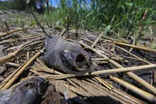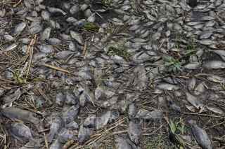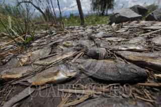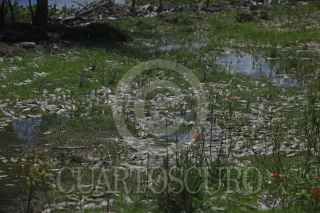 JUANACATLAN, JALISCO.17JULIO2024.- La mortandad de miles de peces de la especie tilapia en las inmediaciones del Rio Santiago a un costado de la ex Hacienda Zapotlanejo, fue un hecho que se genero desde ya días pasados, las causas se desconocen ya que existen algunas hipótesis, pero ninguna confirmada, al lugar acudió personal del Sistema Intermunicipal de los Servicios de Agua Potable y Alcantarillado (SIAPA), para minimizar los olores fétidos colocando cal. FOTO: FERNANDO CARRANZA GARCIA / CUARTOSCURO.COM