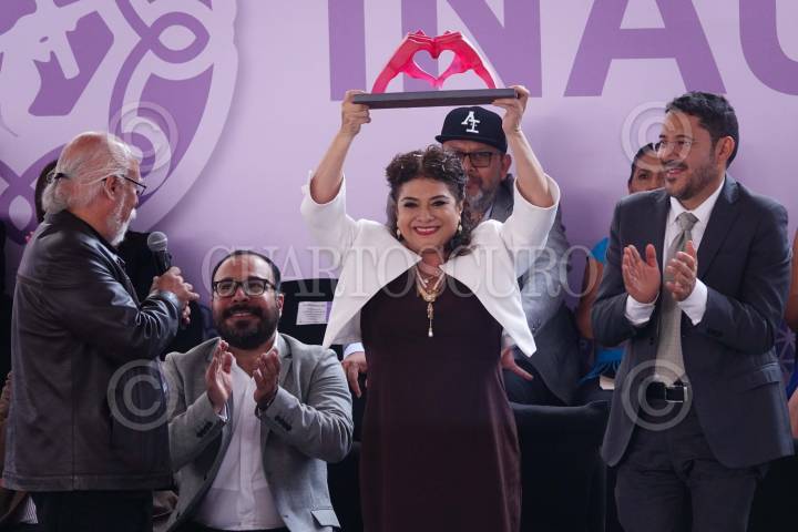 CIUDAD DE MÉXICO, 17JULIO2024.- Clara Brugada, jefa de Gobierno electa, recibió un escultura durante la inauguración de la Utopía Ixtapalcalli, alcaldía Iztapalapa . FOTO: GRACIELA LÓPEZ/CUARTOSCURO.COM