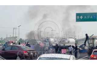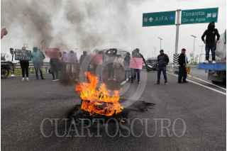 TONANITLA, ESTADO DE MÉXICO, 17JULIO2024.- Desde las primera de hoy se registró un bloqueo en los accesos al Aeropuerto Internacional Felipe Ángeles (AIFA) el cual fue llevado a cabo por vecinos del municipio de Tonanitla, quienes mantienen cerrada la circulación en Boulevard Ojo de Agua y el viaducto que lleva a la terminal aérea, por lo que elementos de la Guardia Civil de Tecámac están desviando la circulación y orientando a los automovilistas que no pueden pasar. Los manifestantes, quienes mantienen el bloqueo con pipas de agua, vehículos y hasta con llantas quemadas, explicaron que esta protesta es consecuencia del conflicto por los límites territoriales que mantienen los municipios mexiquenses de Tecámac y Tonanitla; los vecinos acusan que las autoridades de este último quieren quedarse con un terreno que le corresponde a su demarcación, por lo que advierten que no se retirarán hasta que los atiendan. FOTO: CUARTOSCURO.COM