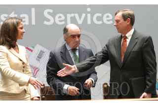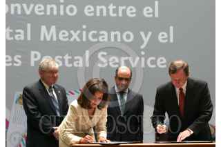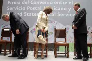 MÉXICO, D.F., 14AGOSTO2007.- Alezander Lazaroff, Purificaciñon Carpinteyro, directora de Sepomex y Paul Vogel, Director de United State Postal Services, durante la firma de convenio entre ambas instituciones postales en el Palacio Postal. FOTO: MOISÉS PABLO/CUARTOSCURO.COM
