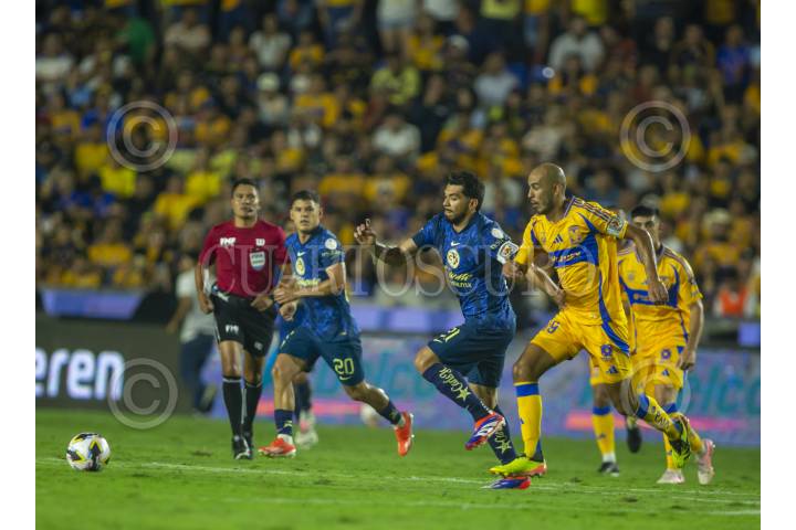 SAN NICOLÁS DE LOS GARZA, NUEVO LEÓN, 17JULIO2024.- Guido Pizarro de Tigres, se disputa el balón con Henry Martín del América, en el estadio Universitario, partido correspondiente a la jornada 3 de la Apertura 2024 de la Liga Mx. Marcador Final: Tigres: 1 - América: 0. FOTO: GABRIELA PÉREZ MONTIEL / CUARTOSCURO.COM