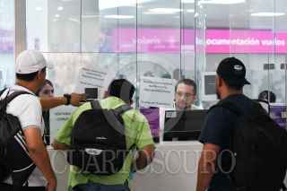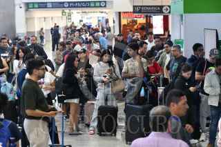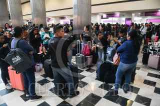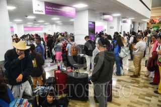CIUDAD DE MÉXICO, 18JULIO2024.- Usuarios de la Terminal 1 del Aeropuerto Internacional de la Ciudad de México esperan en largas filas luego de los retrasos en vuelos que provocaron las fallas en los sistemas operativos de "Microsoft" en varios países. "CrowdStrike" empresa estadounidense de ciberseguridad, recientemente indicó que el problema no fue causado por un ciberataque, sino por un defecto de actualización de software. FOTO: MARIO JASSO/CUARTOSCURO.COM