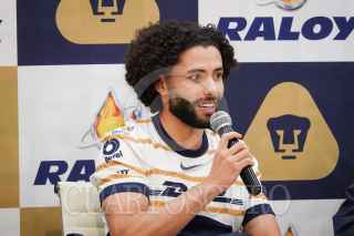 CIUDAD DE MÉXICO, 19JULIO2024.- César “Chino” Huerta (delantero) durante la conferencia en que se anunció al nuevo patrocinador del Club, la marca mexicana de aceites automotores Raloy. FOTO: GALO CAÑAS/CUARTOSCURO.COM