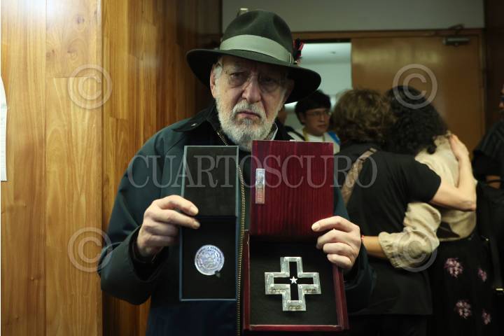 LEÓN, GUANAJUATO, 20JULIO2024. El cineasta Arturo Ripstein muestra la medalla de la Filmoteca de la UNAM y la Cruz de Más Cine Por Favor emblema del Festival Internacional de Cine de Guanajuato (GIFF) al término del homenaje que recibió en el Teatro Bicentenario. FOTO: EDGAR NEGRETE LIRA/CUARTOSCURO.COM