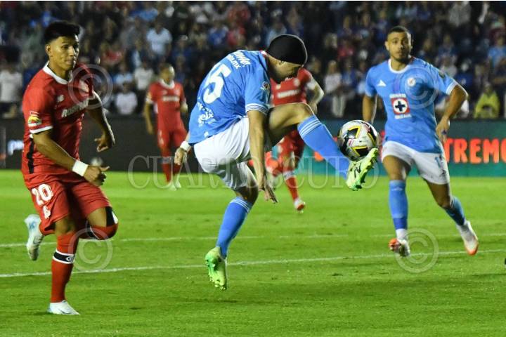 CIUDAD DE MÉXICO, 20JULIO2014.- José Rivero, mediocampista de Cruz Azul, controla el balón ante la presencia de Jesús Gallardo, defensa de Toluca, durante el partido correspondiente a la jornada 4 del Torneo Apertura 2024 de la Liga MX llevado a cabo en el estadio Ciudad de los Deportes. FOTO: MARIO JASSO/CUARTOSCURO.COM