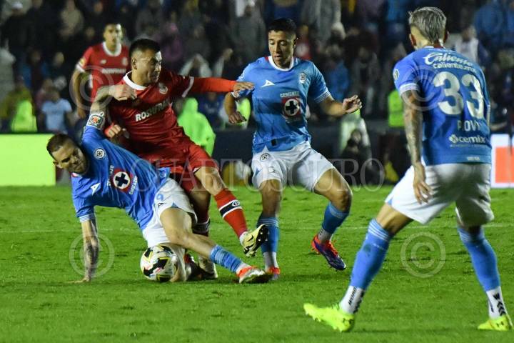 CIUDAD DE MÉXICO, 20JULIO2014.- Carlos Rotondi, delantero de Cruz Azul, disputa el balón frente a Jean Meneses, mediocampista de Toluca, durante el partido correspondiente a la jornada 4 del Torneo Apertura 2024 de la Liga MX llevado a cabo en el estadio Ciudad de los Deportes. FOTO: MARIO JASSO/CUARTOSCURO.COM