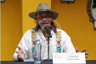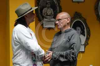 CIUDAD DE MÉXICO, 21JULIO2024.- Catarino Hernández, hijo de Carmelo Cortés, y Luis Carlos Pichardo, director del Museo Casa de la Memoria Indómita, se saludaron durante una conferencia de prensa en la Casa de la Memoria Indómita. FOTO: GRACIELA LÓPEZ /CUARTOSCURO.COM