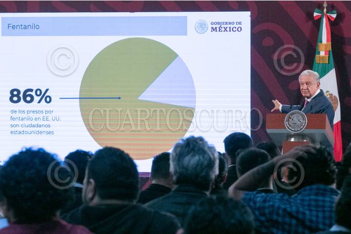 CIUDAD DE MÉXICO, 22JULIO2024.- Andrés Manuel López Obrador, Presidente de México, muestra una gráfica en la que asegura que el 86? los detenidos por posesión de fentanilo son estadounidenses en Estados Unidos, esto ante los dichos de los republicanos que afirman que los migrantes mexicanos son los que llevan esta droga a si territorio. FOTO: MOISÉS PABLO/CUARTOSCURO.COM