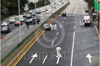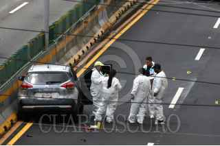 CUERNAVACA, MORELOS, 22JULIO2024.- Elementos de la Unidad de Criminalística y Escena del Crimen de la Fiscalía del Estado, recaban evidencias en los carriles norte-sur del Paso Exprés de Cuernavaca, donde esta mañana un policía de la capital fue asesinado. Según información oficial, el policía Luis Ricardo G salió de la base de la policía después de que termino el turno nocturno que cubría, manejando su vehículo, se dirigió hacia el oriente y al llegar a la Paloma de la Paz sus victimarios lo comenzaron a perseguir y después lo atacaron a balazos hasta que ingreso al Paso Exprés, donde se estrello contra la barrera y fue rematado. El presidente municipal, José Luis Urióstegui, declaro sobre este hecho que el policía era de nuevo ingreso y había recibido amenazas del crimen organizado en mantas dejadas en la vía publica, por lo cual estaba autorizado a portar arma en su tiempo franco. Mas temprano el cadáver de un hombre desmembrado fue dejado en el poblado de Acapantzingo, mas tarde una pareja fue atacada a balazos en el municipio de Emiliano Zapata, muriendo ambos. En todos estos casos, personal del Servicio Medico Forense levanto a las victimas y fueron llevados a la morgue donde esperan sean reconocidos y reclamados. FOTO: MARGARITO PÉREZ RETANA/CUARTOSCURO