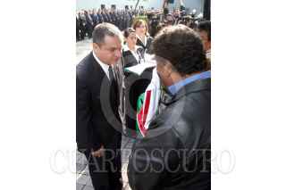 MÉXICO, D.F., 18AGOSTO2007.- Se rindió un homenaje de cuerpo presente a los agentes René Lorenzo López y Roberto Krhisna Raúl Martínez Saavedra, quienes fueron ultimados en Nuevo León; así como a Francisco Ezequiel Soberanes Escalante, asesinado en Michoacán; y a Erika Grisel Contreras García, abatida el pasado 14 de agosto en el estado de Chiapas. Genaro García Luna, secretario de seguridad pública le da sus condolencia a los familiares. FOTO:PEDRO MARRUFO/CUARTOSCURO.COM