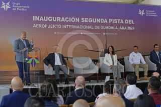GUADALAJARA, JALISCO. 23JULIO2024.- Hoy el Aeropuerto Internacional de Guadalajara puso en operación su segunda pista, con el primer vuelo inaugural. Esta pista tiene una extensión de 3,538 metros de largo y 45 metros de ancho, de esta manera es el cuarto aeropuerto del país en tener una segunda pista, esta inversión es parte de los proyectos del Grupo Aeroportuario del Pacifico (GAP), del 2020-2024 y alcanzo la cifra de 15,900 millones de pesos. Además de la segunda pista, se modernizo la terminal 1, en aviación en general se construyo una nueva plataforma de 126, 090m2, 83 posiciones de aviones, cuatro para helicópteros, 45 hangares y nuevas instalaciones para autoridades gubernamentales. También se inauguro el edificio de usos múltiples, que incluye un hotel con 180 habitaciones ya en operación, dos edificios de oficinas, una plaza comercial con dos niveles entre otros servicios, la inauguración fue encabezada por el Gobernador del Estado Enrique Alfaro, entre otras personalidades. FOTO: FERNANDO CARRANZA GARCIA / CUARTOSCURO.COM