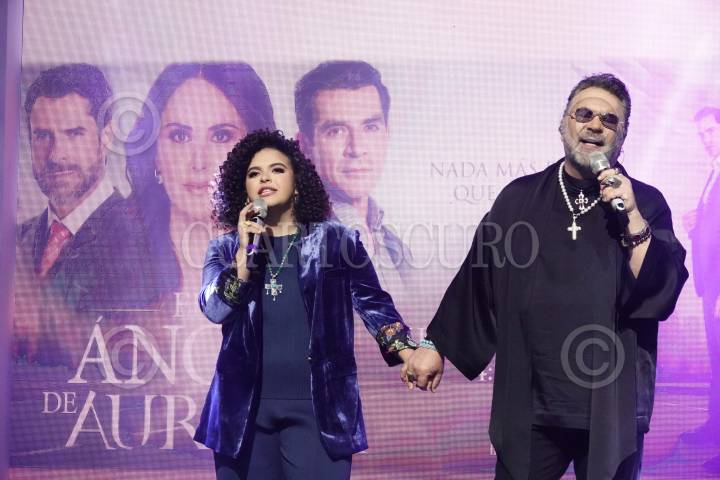 CIUDAD DE MÉXICO, 23JULIO2024.- Los cantantes Lucerito Mijares y Mijares durante la presentación del elenco de la telenovela "El Ángel de Aurora" en Televisa San Ángel. FOTO: GRACIELA LÓPEZ /CUARTOSCURO.COM